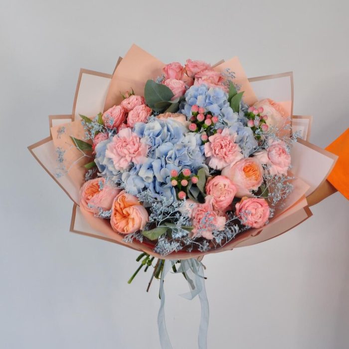 Гиперикум – 3 шт.Гортензия – 2 шт.Роза кустовая – 5 шт.Эвкалипт – 5 шт.Лента атласная – 1 шт.Диантус – 4 шт.Упаковка дизайнерская – 2 шт.Роза пионовидная Джульетта – 5 шт.кермек голубой – 6 шт.хорошее настроение (в подарок) – 1 шт.