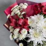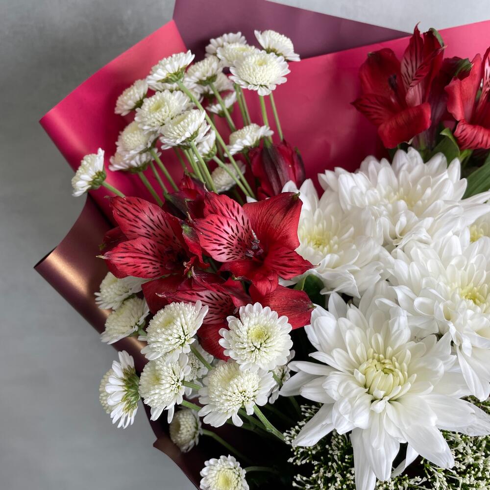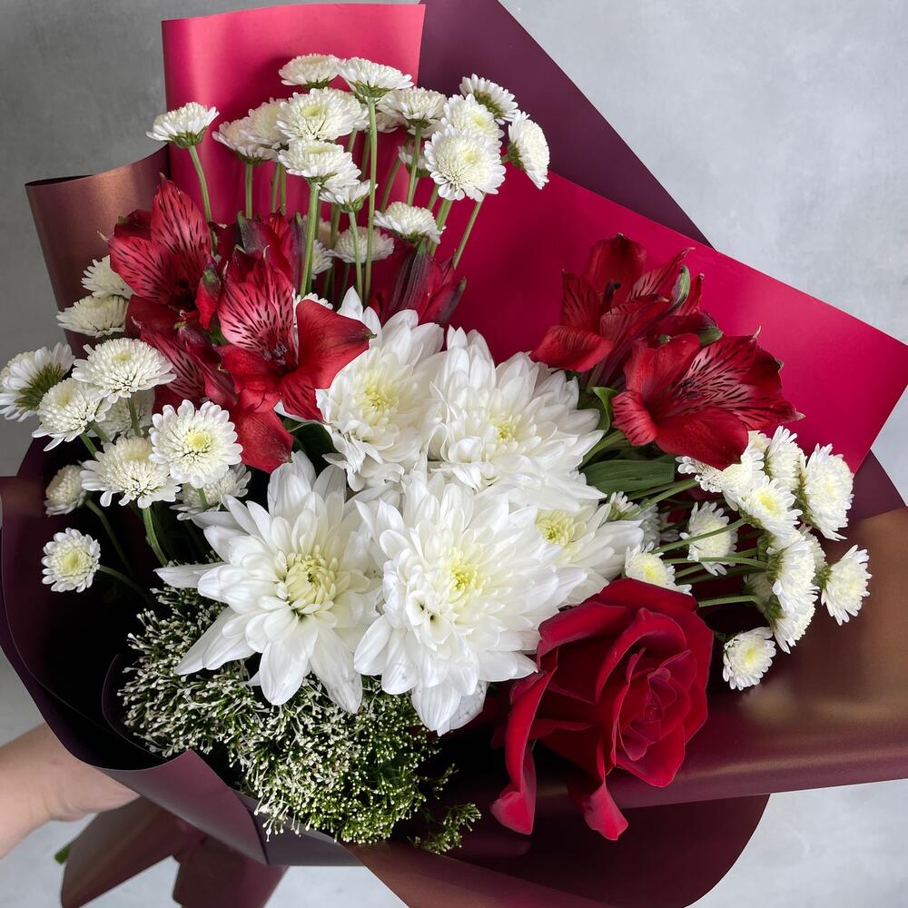Роза Эксплорер – 1 шт.Сталион белый – 3 шт.Хризантема кустовая – 1 шт.Альстромерия – 2 шт.Трахелиум – 1 шт.Упаковка дизайнерская – 1 шт.