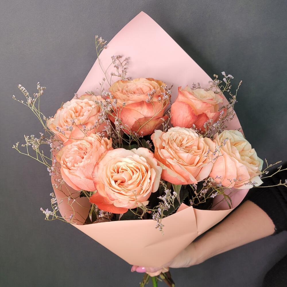 Роза Эквадор – 7 шт.лимониум сухоцвет – 5 шт.Упаковка дизайнерская – 1 шт.Лента атласная – 1 шт.