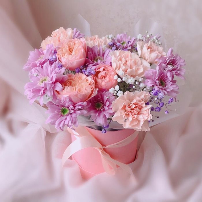 Гипсофила – 2 шт.Хризантема кустовая – 2 шт.Диантус – 5 шт.Шляпная коробка с лентой – 1 шт.Флористическая губка – 1 шт.Пионовидная роза джульетта – 1 шт.инструкция по уходу за цветами – 1 шт.