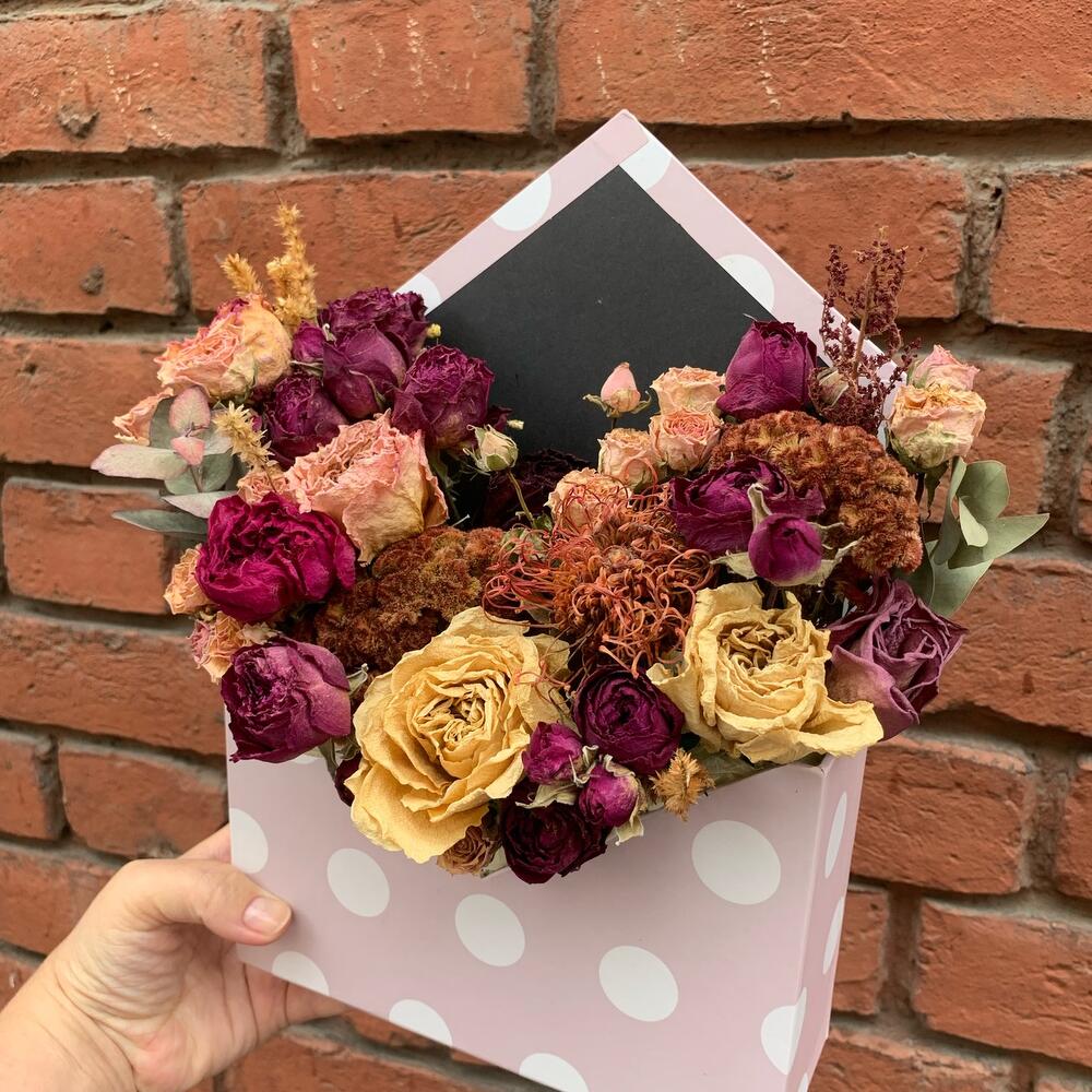 Конверт – 1 шт.роза куст пионовидная – 5 шт.роза пионовидная сухоцвет – 3 шт.нутан сухоцвет – 1 шт.Эвкалипт сухоцвет – 2 шт.целозия сухоцвет – 2 шт.астильба сухоцвет – 1 шт.