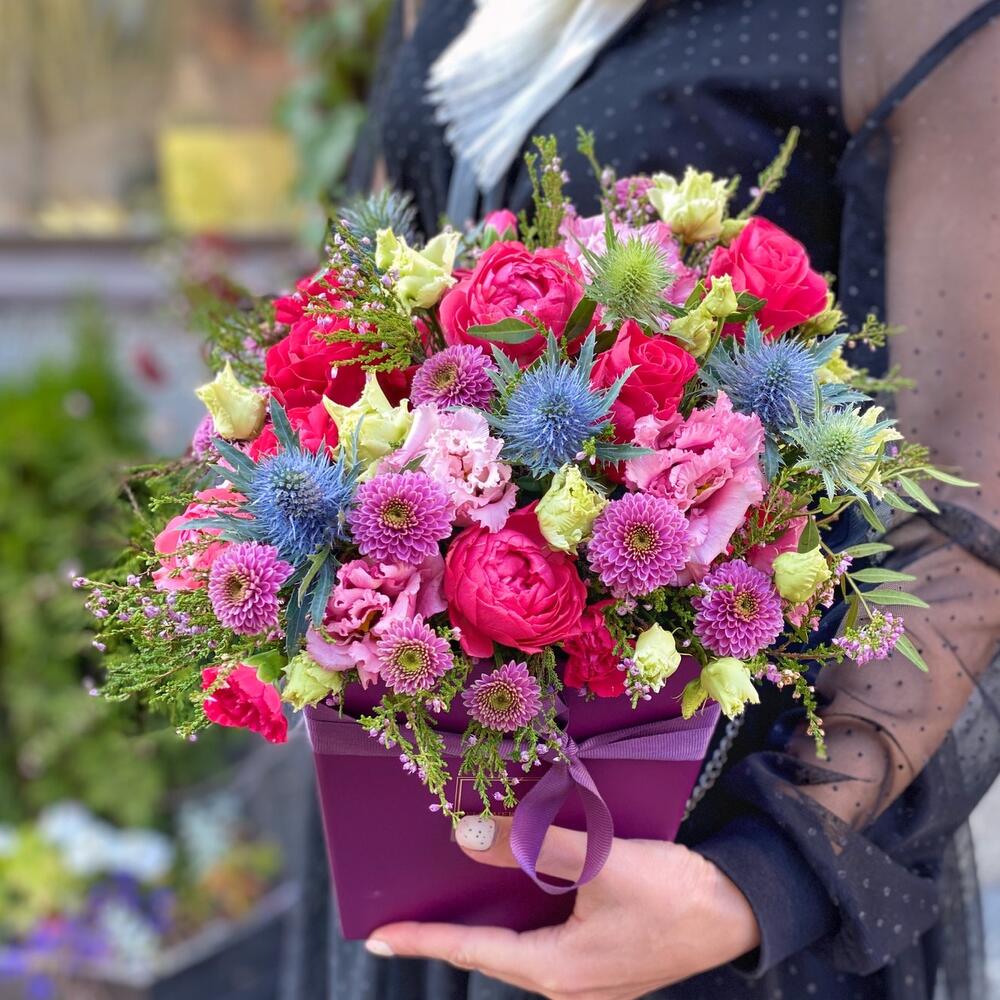 Эрингиум – 1 шт.Роза – 5 шт.Сантини – 2 шт.Коробка – 1 шт.Пионовидная кустовая роза – 2 шт.Оазис флористический – 1 шт.Лизиантус алиса пинк – 3 шт.зелень декоративная – 5 шт.цветы в ассортименте – 5 шт.