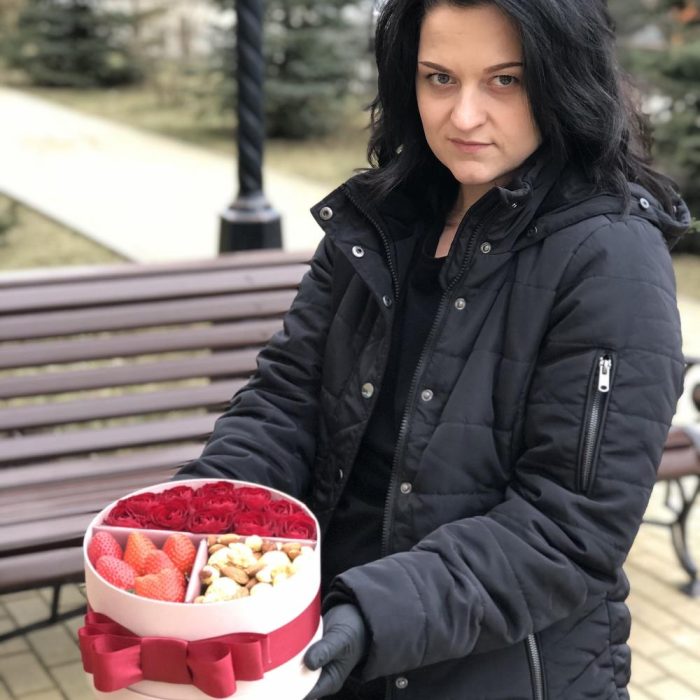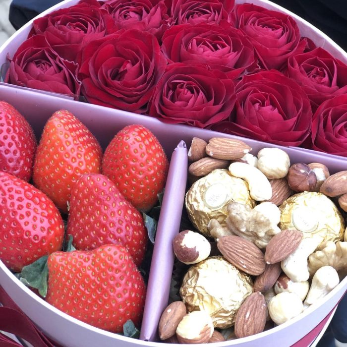 Коробка с розами клубникой орехами и конфетами «Любимой»