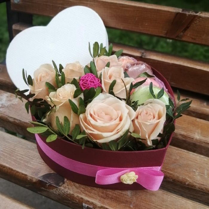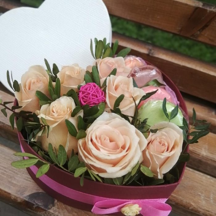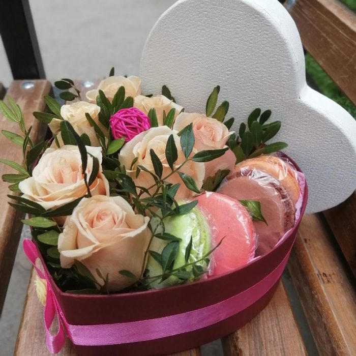 Роза – 7 шт.Зелень – 1 шт.Коробка – 1 шт.Оазис флористический – 1 шт.Макарон – 4 шт.