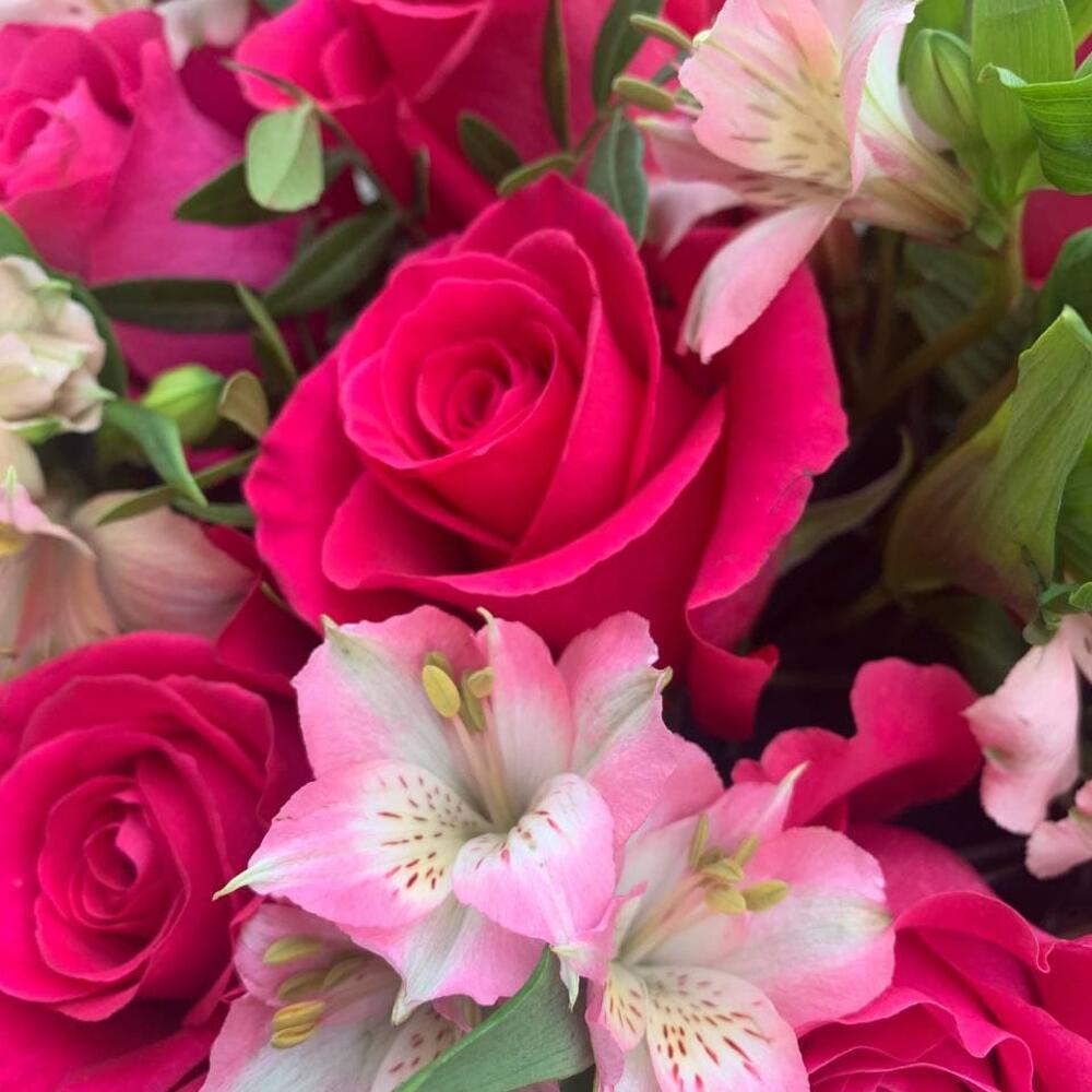 Корзина из альстромерий,розовых роз и зелени Синтия