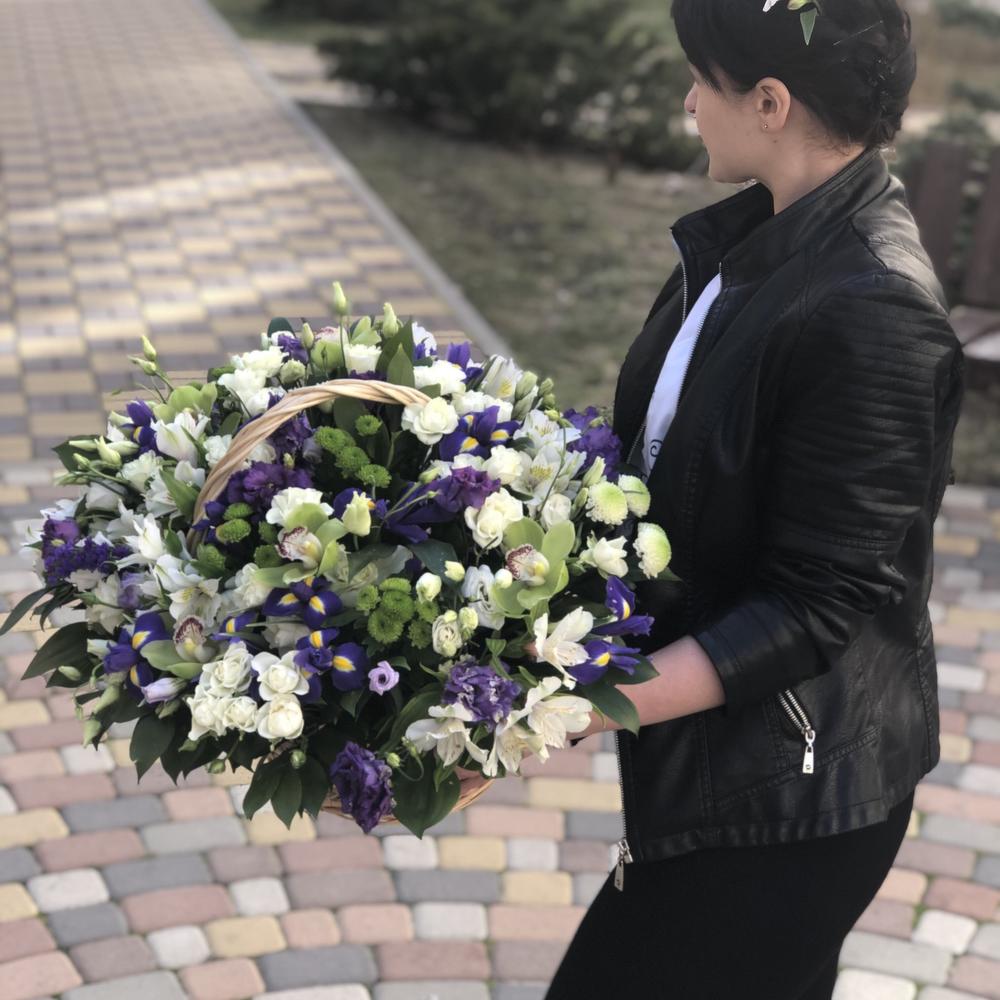 Ирис – 15 шт.Корзина – 1 шт.Эустома – 15 шт.Оазис флористический – 2 шт.Роза кустовая – 10 шт.Альстромерия – 10 шт.Хризантема кустовая – 10 шт.Орхидея Цимбидиум – 7 шт.Зелень – 20 шт.