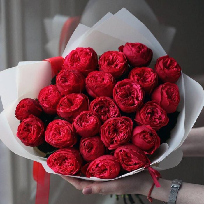 25 бордовых пионов