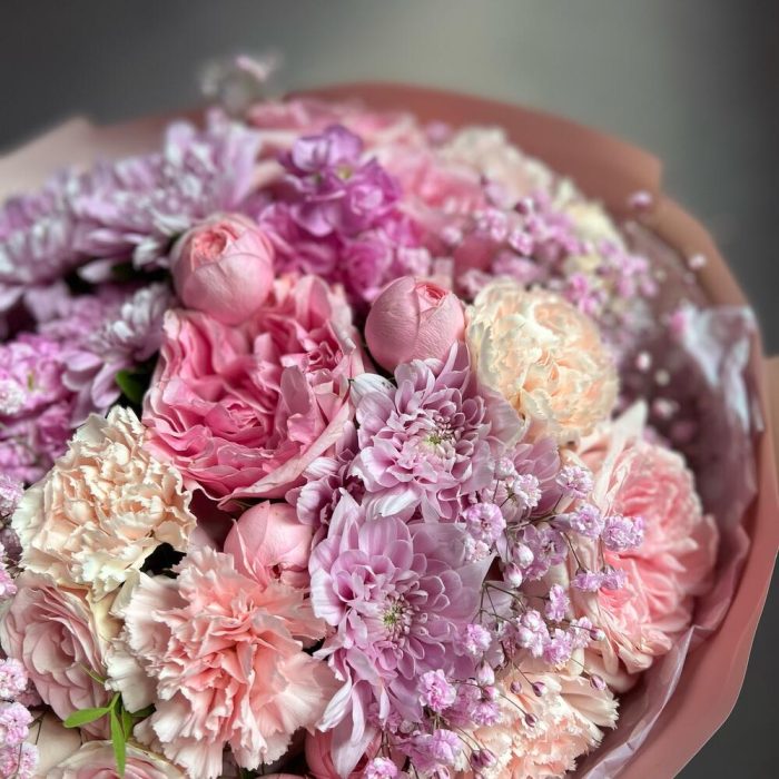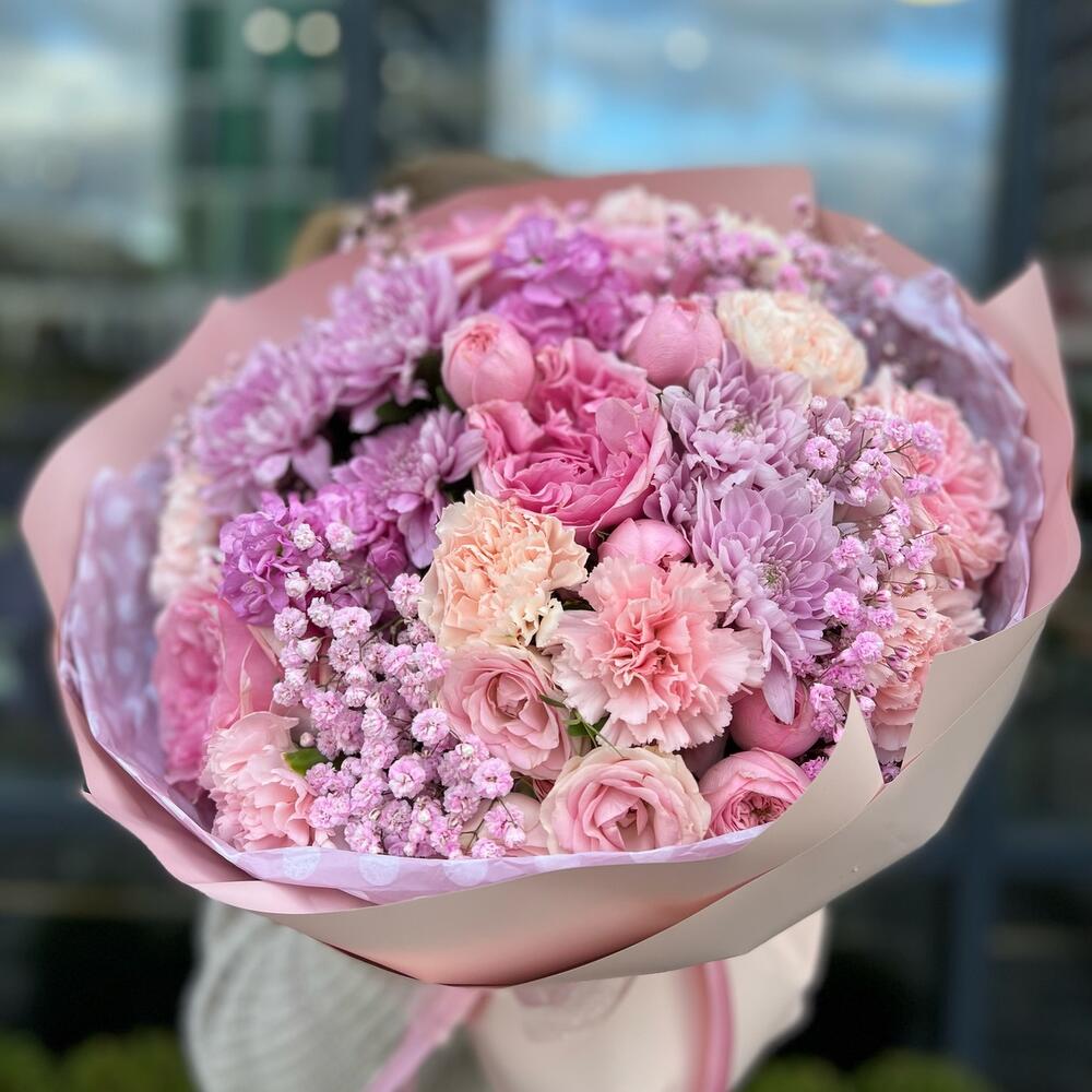 Пионовидная роза – 5 шт.Диантус – 9 шт.Кустовая хризантема – 2 шт.Маттиола – 2 шт.Кустовая роза – 1 шт.Пионовидная кустовая роза – 2 шт.Гипсофила – 1 шт.декоративная упаковка – 1 шт.Атласная лента – 1 шт.