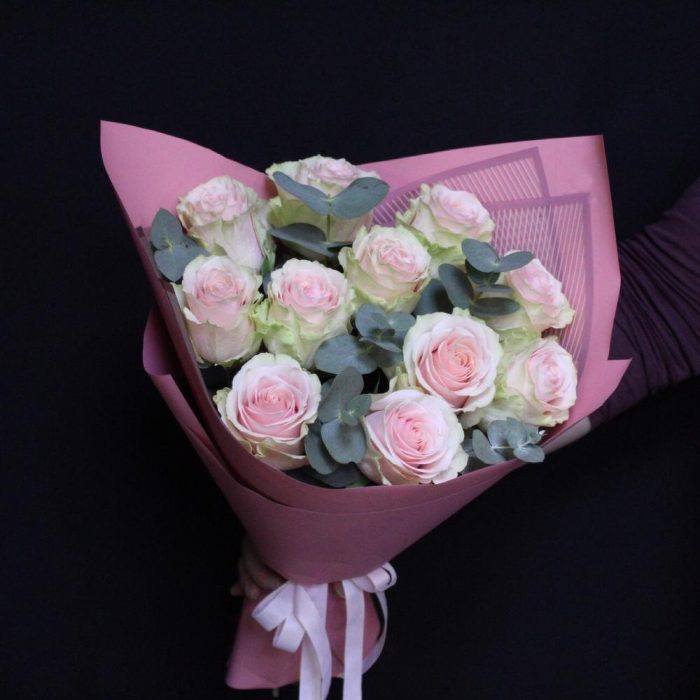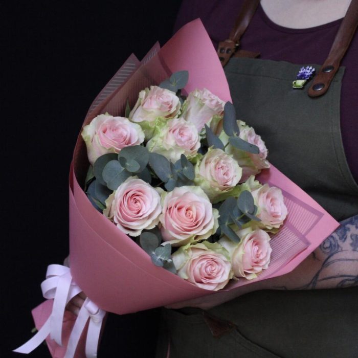 роза фрутетто – 11 шт.Эвкалипт – 3 шт.Пленка дизайнерская – 3 шт.Лента атласная – 2 шт.