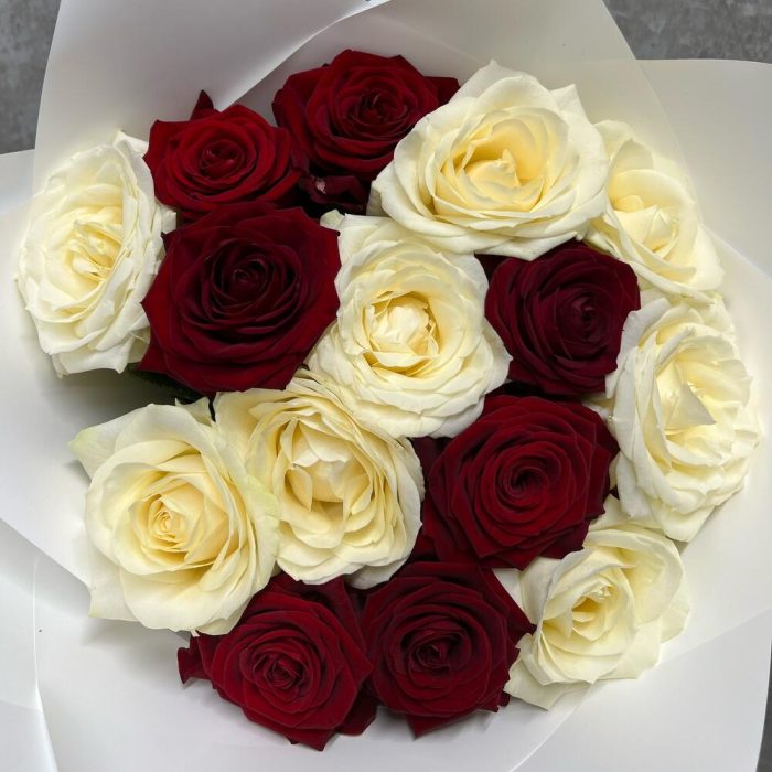 роза красная ред наоими – 7 шт.Роза белая аваланж – 8 шт.Упаковка дизайнерская – 1 шт.Лента – 1 шт.