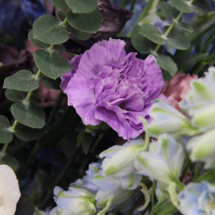 Дельфиниум – 9 шт.Лизиантус – 11 шт.Диантус – 15 шт.Роза пионовидная – 7 шт.Твидия – 5 шт.Эвкалипт – 9 шт.Фисташка – 4 шт.Лента атласная – 3 шт.
