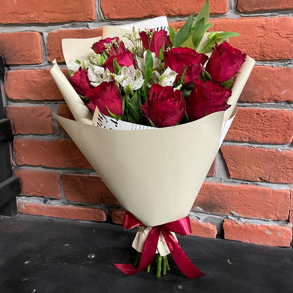Роза красная – 9 шт.Альстромерия – 3 шт.Лимониум – 1 шт.Упаковка дизайнерская – 1 шт.Лента атласная – 1 шт.