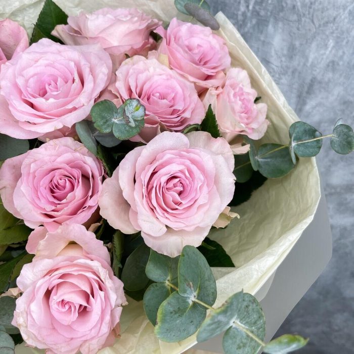 Роза – 11 шт.Эвкалипт – 2 шт.Упаковка дизайнерская – 2 шт.Лента атласная – 2 шт.