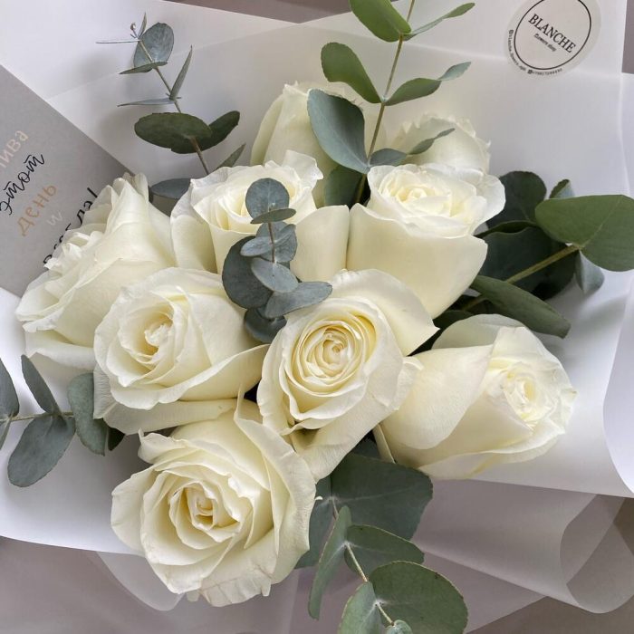 Атласная лента – 1 шт.белая матовая пленка – 2 шт.ветка эвкалипта – 5 шт.proud роза белая – 9 шт.корейская упаковка белая – 2 шт.
