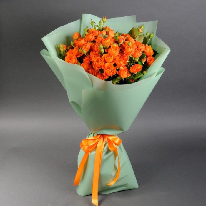 оранжевые кустовые розы – 13 шт. Открыточка с вашими пожеланиями – 1 шт. Упаковка дизайнерская – 1 шт.