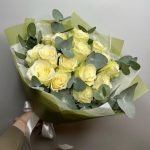 Роза персиковая – 15 шт. эвкалипт круглый или длинный – 9 шт. Упаковка дизайнерская – 2 шт. Открыточка с вашими пожеланиями – 1 шт. инструкция по уходу за цветами – 1 шт.