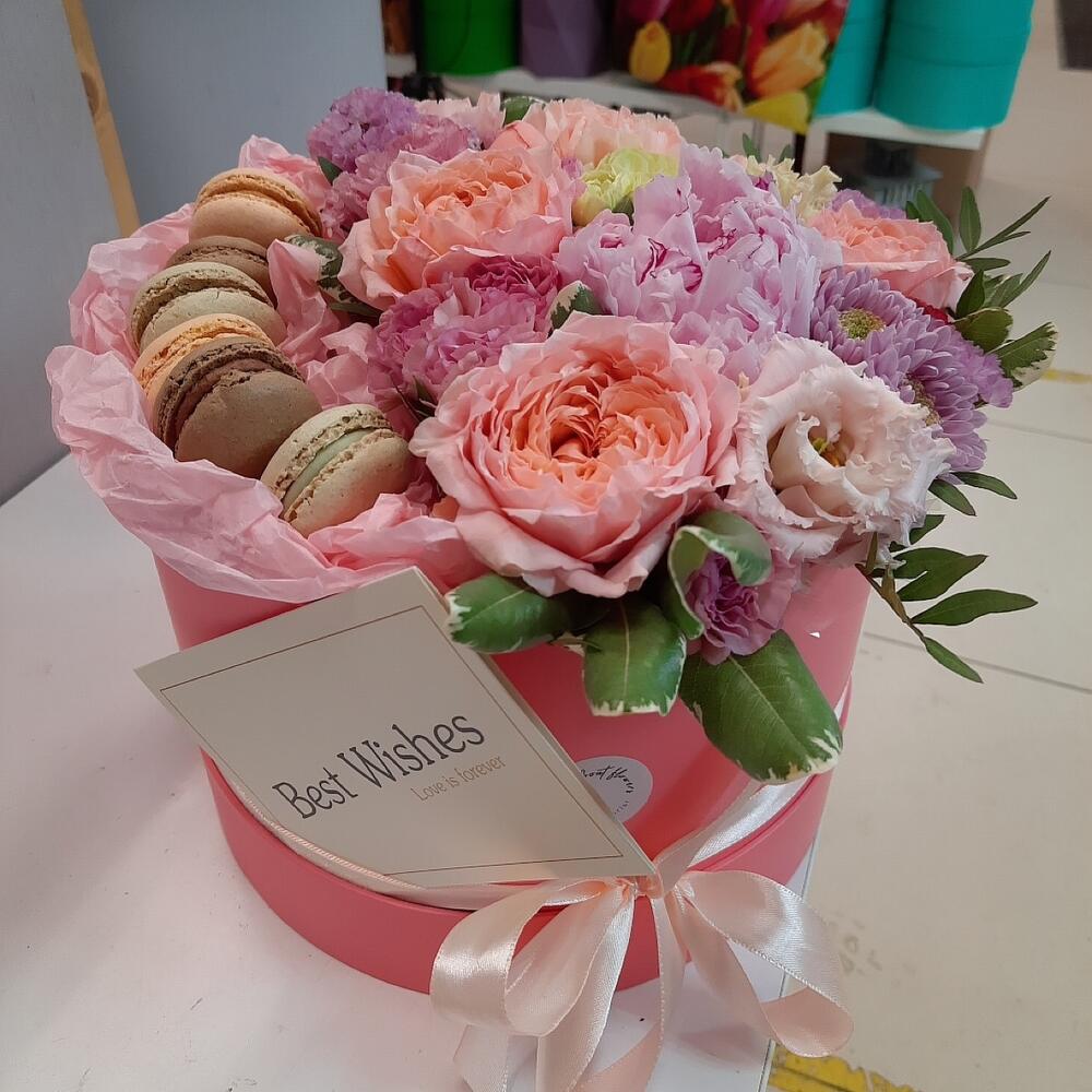 Статица – 1 шт.Хризантема кустовая – 1 шт.Коробка шляпная – 1 шт.Роза пионовидная – 3 шт.Пион Сара Бернар – 1 шт.Диантус кустовой – 2 шт.Пирожные макарон – 6 шт.Диантус сортовой – 3 шт.Эустома алиса – 1 шт.Губка флористическая – 1 шт.зелень декоративная – 3 шт.