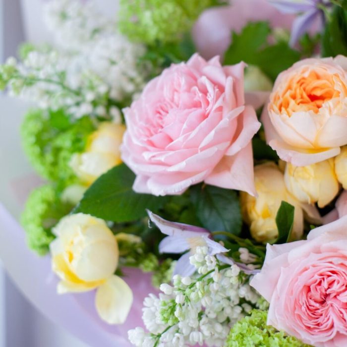 Пышный весенний букет с сиренью и пионовидными розами