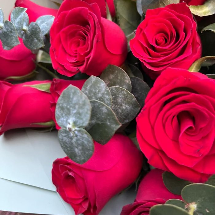 Эвкалипт – 5 шт.Лента атласная – 1 шт.Упаковка корейская пленка – 1 шт.роза кения красная – 15 шт.