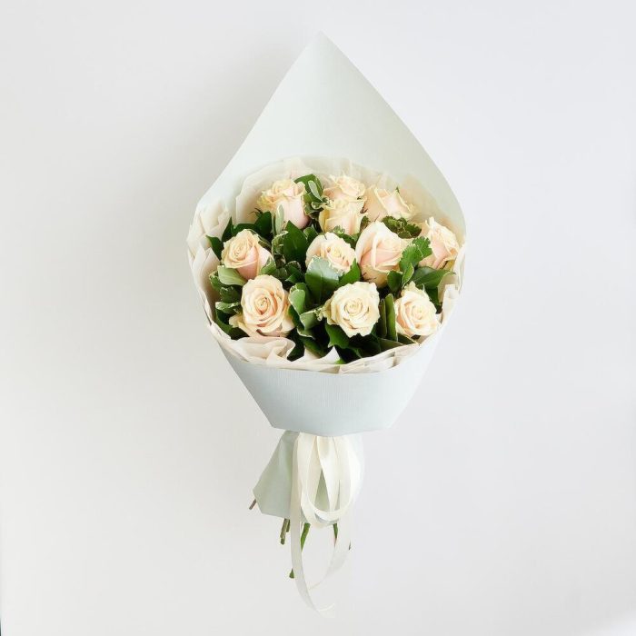 розы талея – 11 шт. Зелень – 5 шт. Открыточка с вашими пожеланиями – 1 шт. Упаковка дизайнерская – 2 шт.