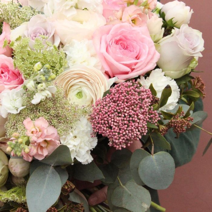 Ранункулюс – 9 шт.Роза пионовидная – 15 шт.Амми – 4 шт.Озотамнус – 3 шт.Маттиола – 11 шт.Вибурнум – 3 шт.Эвкалипт – 9 шт.Лента атласная – 1 шт.
