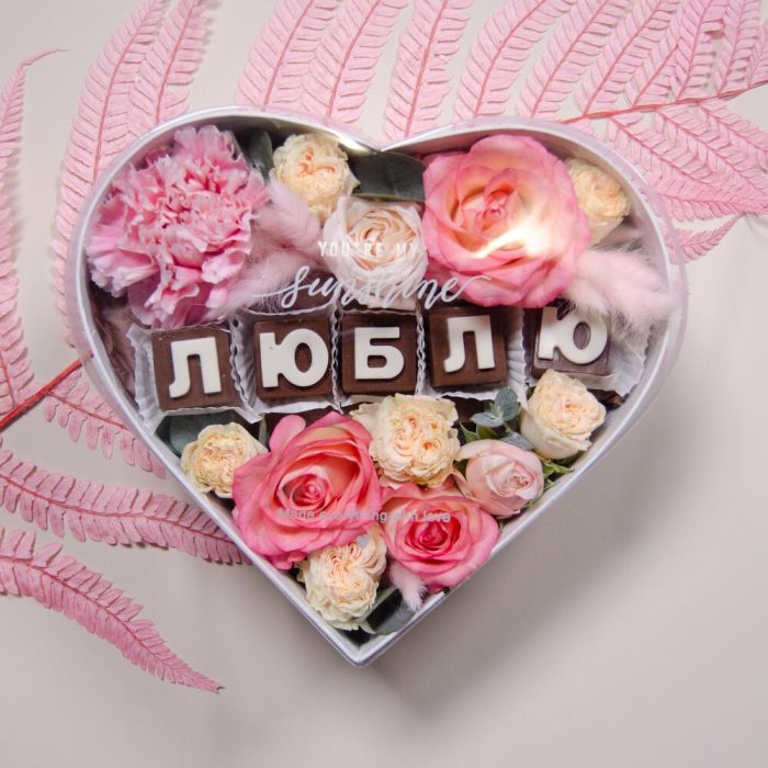 “Сладкое сердце ” – цветочная композиция с сладостями в коробке “Сердце”