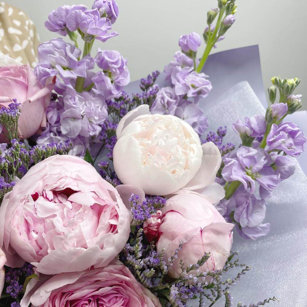 Лимониум – 2 шт.Маттиола – 4 шт.Роза пионовидная – 4 шт.Пион Сара Бернар – 3 шт.Упаковка дизайнерская – 1 шт.
