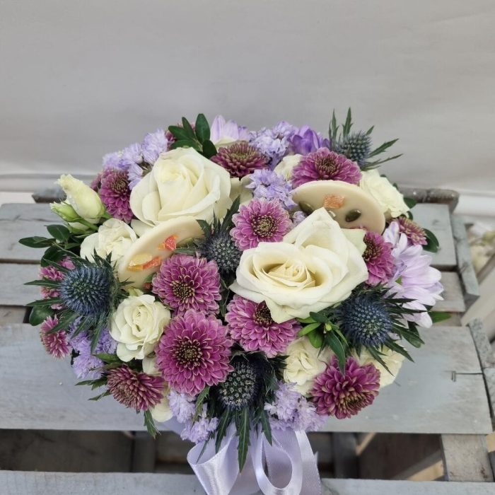 роза кения – 3 шт.Кустовая роза – 1 шт.Сантини микс – 3 шт.Эрингиум – 1 шт.Статица – 1 шт.шоколадный медиант из белого шоколада – 2 шт.