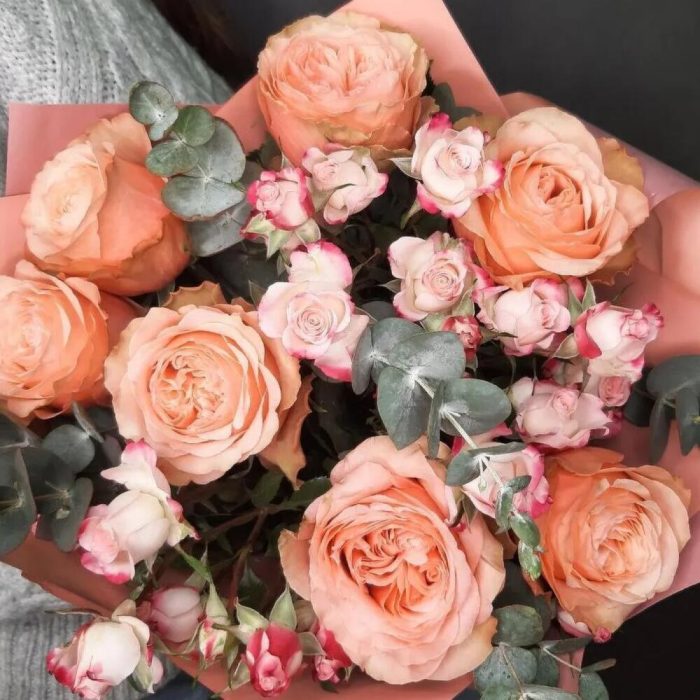 Роза Эквадор – 7 шт.Роза кустовая – 3 шт.Эвкалипт – 2 шт.Упаковка дизайнерская – 1 шт.Лента атласная – 1 шт.