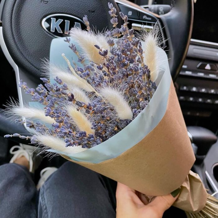 Лаванда (сухоцвет) – 1 шт.Крафт упаковка – 1 шт.Лагурус (сухоцвет) – 11 шт.жгут натуральный – 1 шт.