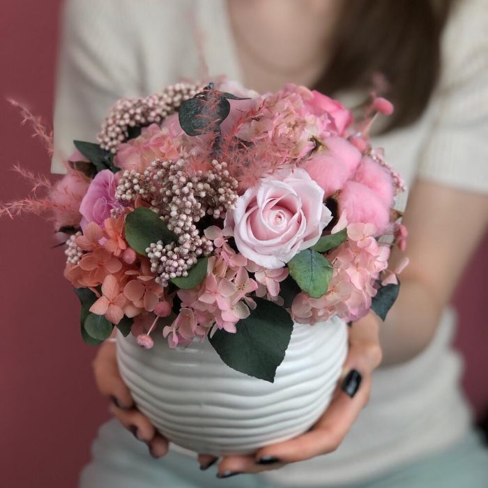 Ваза керамика – 1 шт.цветы стабилизированные микс – 15 шт.Озотамнус – 3 шт.Хлопок – 4 шт.