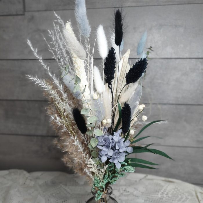 гортензия стабилизированная пучок – 1 шт.мини пампас – 1 шт.ботао – 3 шт.сетария сухоцвет – 1 шт.камыш декоративный – 1 шт.стабилизированный эвкалипт – 1 шт.Эвкалипт сухоцвет – 3 шт.Лагурус – 10 шт.Фаларис – 4 шт.копье пальмы – 1 шт.лен сухоцвет – 1 шт.аурея белая – 1 шт.статица стабилизированная – 1 шт.Ваза стеклянная – 1 шт.