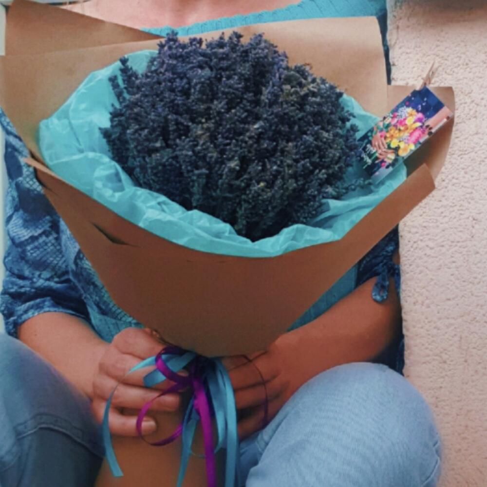 Лаванда (сухоцвет) – 150 гр.Лента атласная – 2 шт.Крафт упаковка – 1 шт.Открыточка с вашими пожеланиями – 1 шт.тишью бирюзовое – 3 шт.