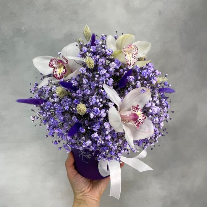 Гипсофила – 5 шт.Орхидея Цимбидиум – 3 шт.Оазис – 1 шт.Лагурус – 11 шт.Фаларис – 11 шт.Коробка d12 – 1 шт.