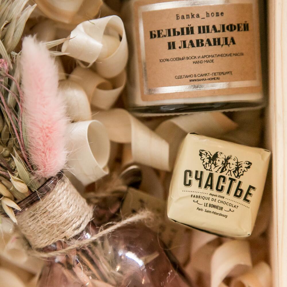 Ящик деревянный – 1 шт.Ваза стекло – 1 шт.букет сухоцветов – 1 шт.свеча банка home – 1 шт.бомбочка из натуральных масел для ванной – 1 шт.конфеты счастье – 2 шт.подарочный сертификат на 5000 ( цветы и подарки сети флора point) – 1 шт.