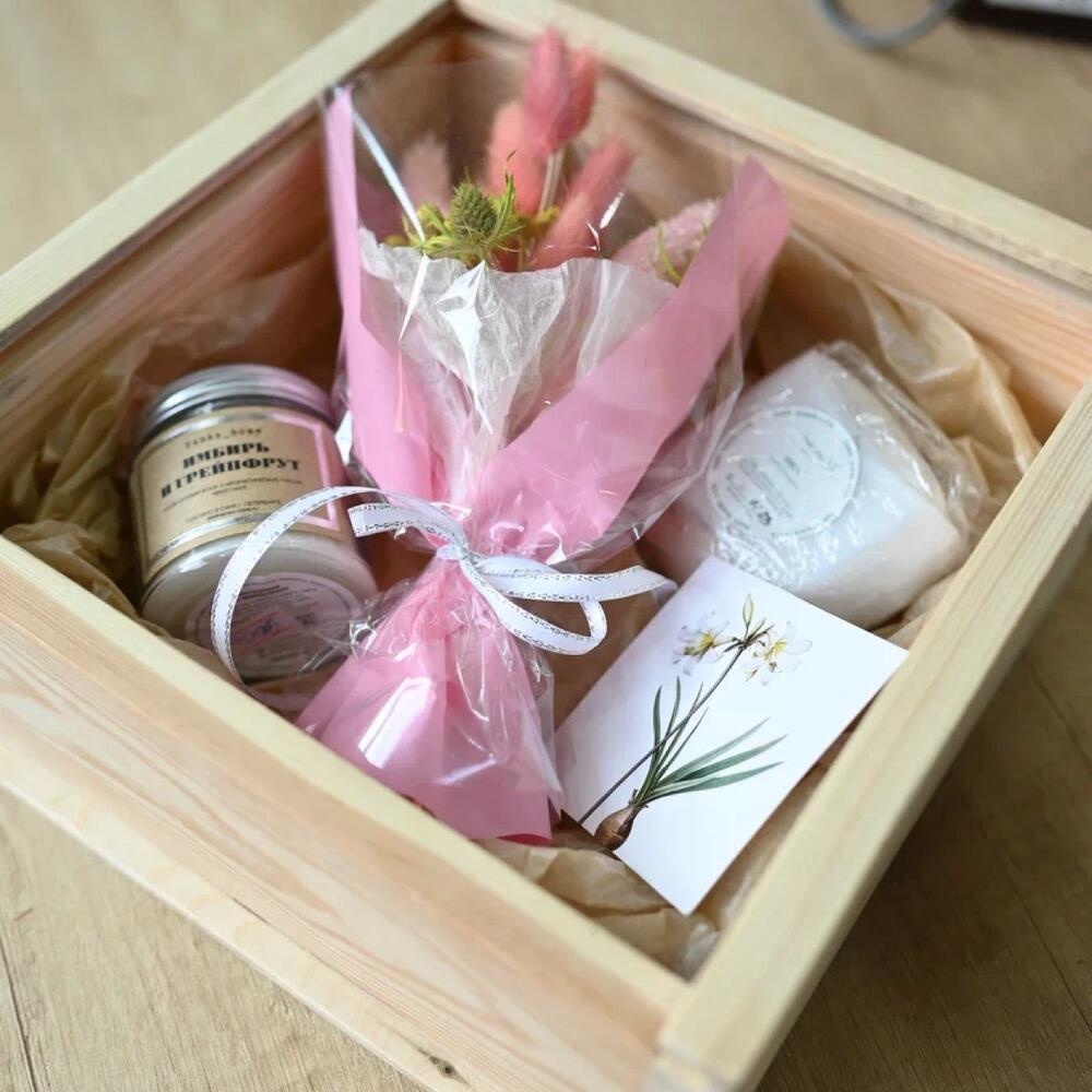 Ящик деревянный – 1 шт.Наполнитель бумажный – 1 шт.свеча из соевого воска – 1 шт.букетик из сухоцветов – 1 шт.бомбочка для ванной ручной работы – 1 шт.Открытка – 1 шт.