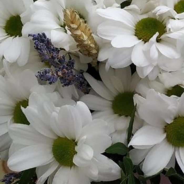 Лаванда (сухоцвет) – 25 шт.Коробка шляпная – 1 шт.Флористическая губка – 1 шт.Пшеница (сухоцвет) – 15 шт.ромашки – 25 шт.