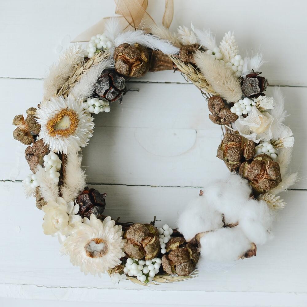 Основа для венка – 1 шт.Хлопок – 1 шт.сухоцветы микс – 1 шт.ветка искусственная белая – 1 шт.Тишью – 1 шт.Коробка – 1 шт.