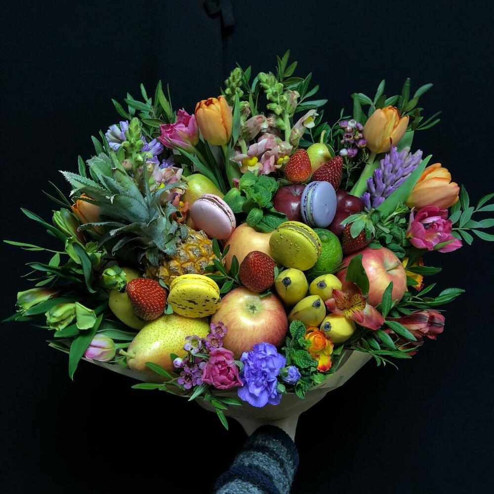 Лимон – 5 шт.яблоки – 7 шт.груши – 6 шт.Тюльпан – 4 шт.клубника или смородина – 7 шт.Лагурус – 8 шт.фисташка зелень – 4 шт.макарон (пирожное) – 4 шт.мини бананы – 12 шт.Мини ананас – 1 шт.альстромерия или статица – 8 шт.