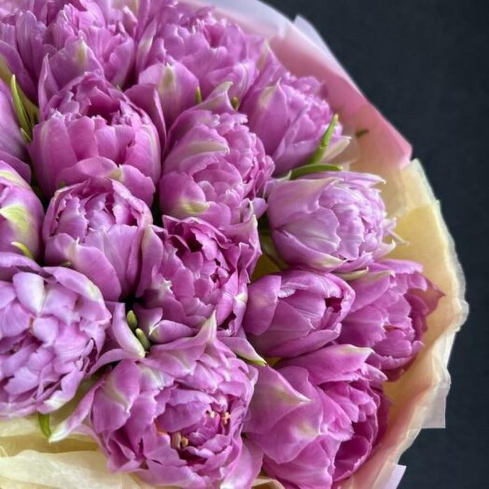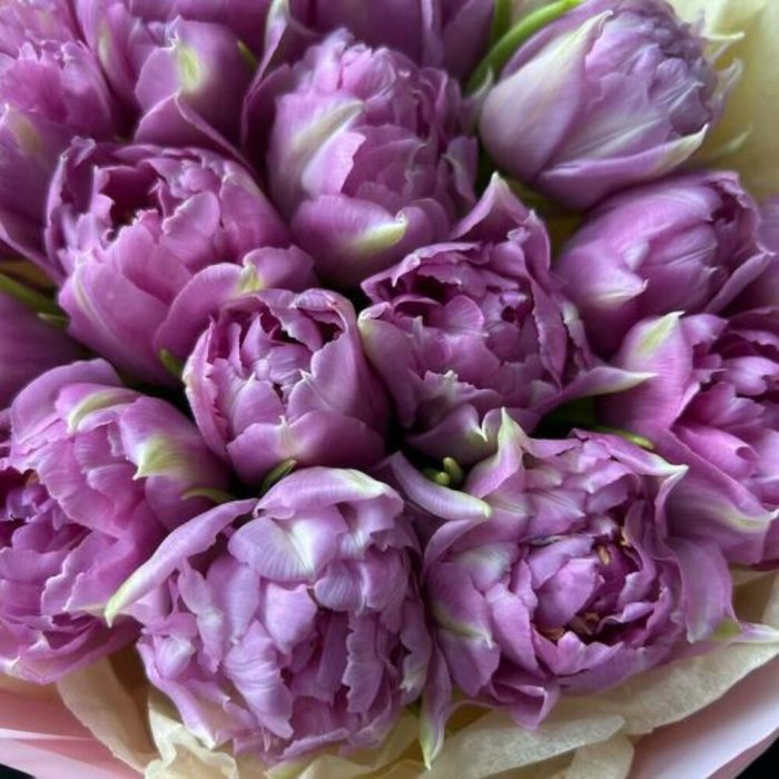 тюльпаны – 15 шт.декоративная упаковка – 1 шт.Атласная лента – 1 шт.