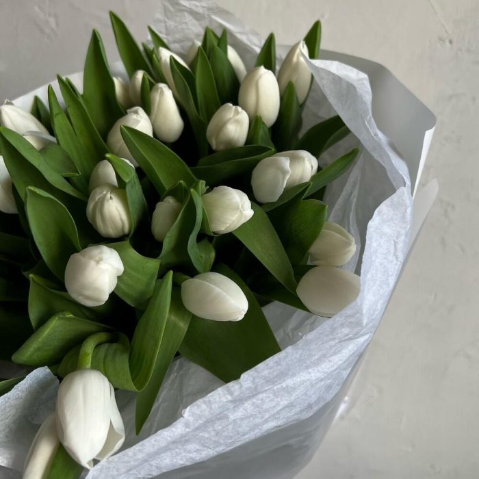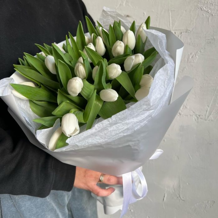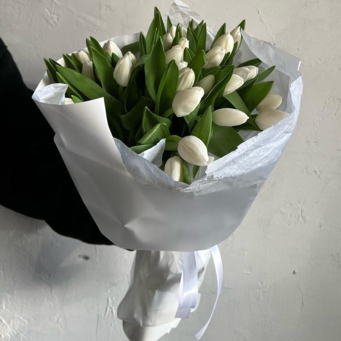 Лента атласная – 2 шт.Упаковка дизайнерская – 3 шт.Тюльпан белый – 29 шт.
