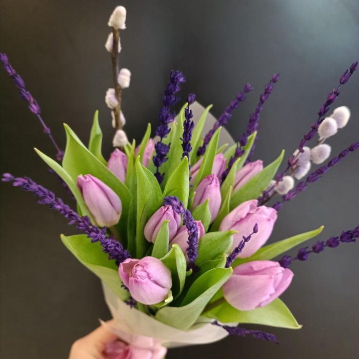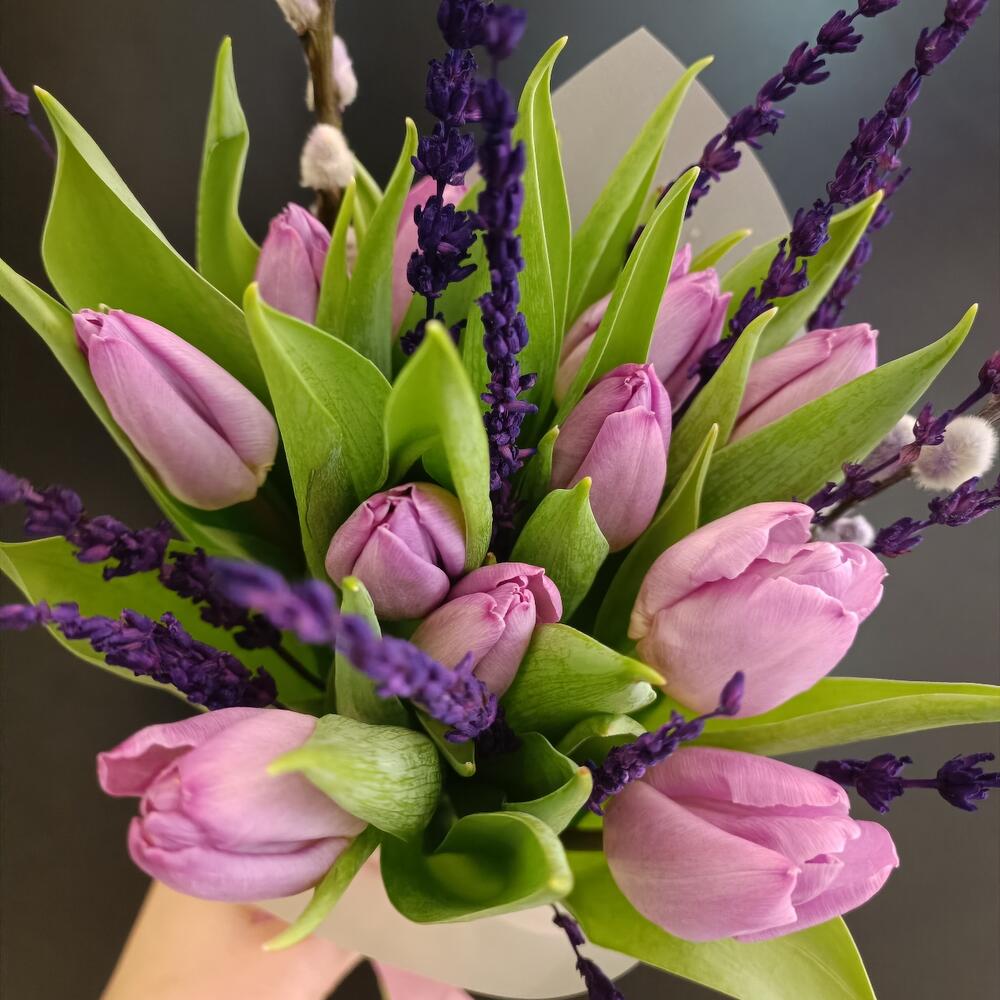 Тюльпан – 11 шт.лаванда стабилизированная пучок – 1 шт.Упаковка – 1 шт.Лента – 1 шт.транспортировочная упаковка – 1 шт.