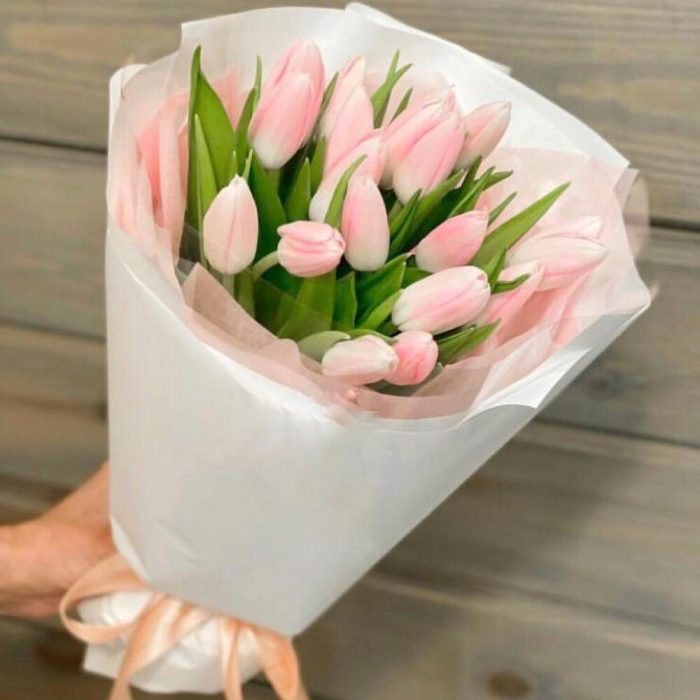 Тюльпан – 15 шт.Лента атласная – 1 шт.Тишью – 2 шт.Упаковка дизайнерская – 2 шт.