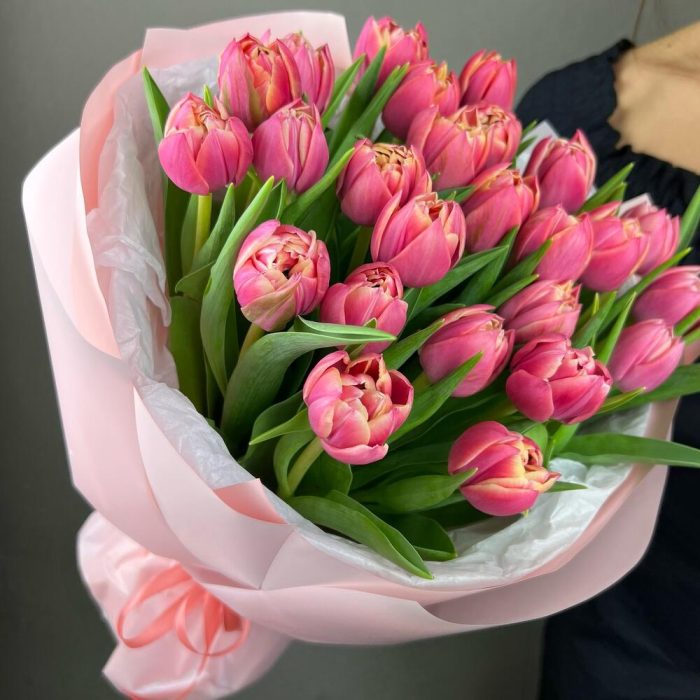 Тюльпан – 25 шт.Лента атласная – 1 шт.Бумага тишью – 1 шт.пленка калька – 1 шт.