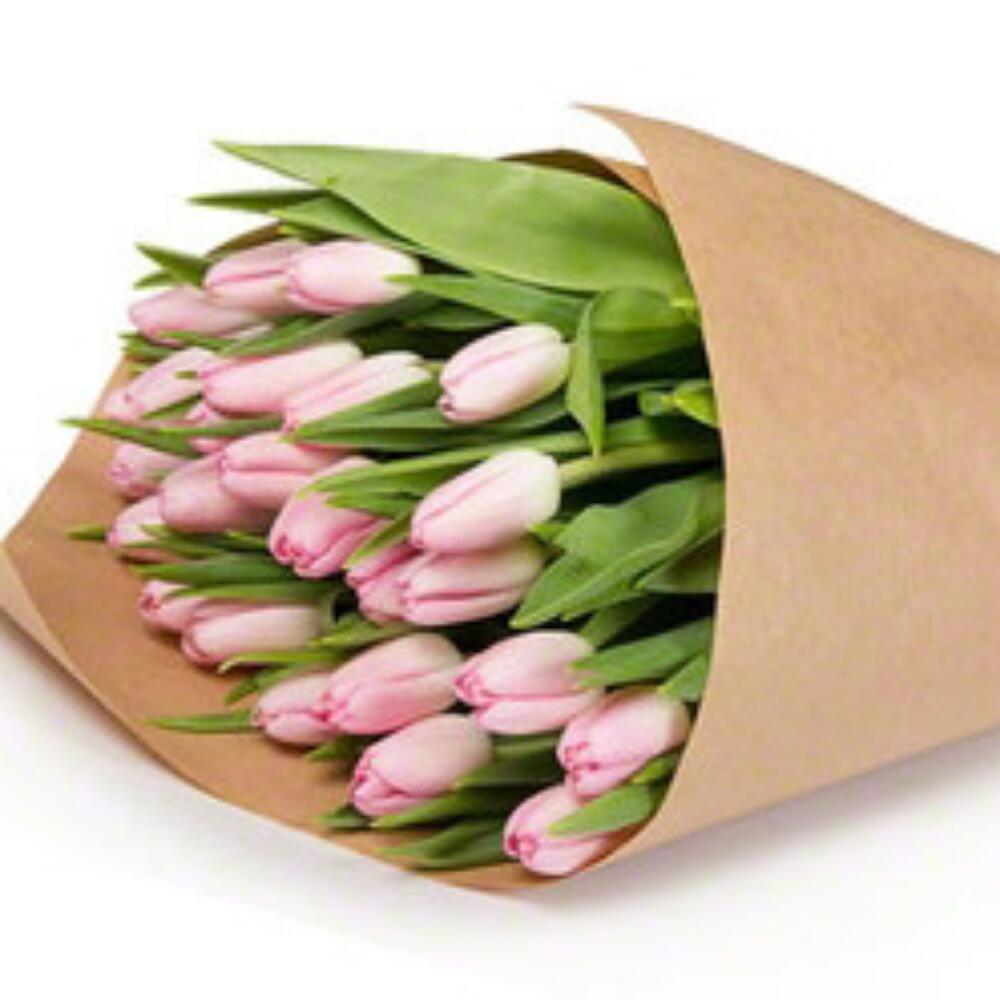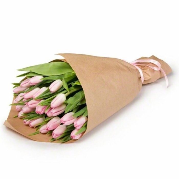 Тюльпан – 25 шт.Лента атласная – 1 шт.Крафт упаковка – 1 шт.